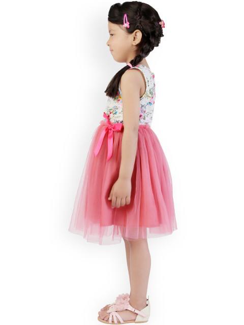 White and pink botanical print sew and woven fit and flare dress with bow detail, has a round neck, sleeveless, catch terminations on the back, flared sew, a connected coating.